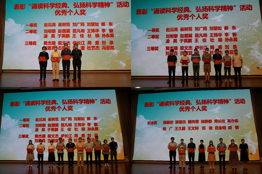 各支部经过初选,共向所党委推荐读后感36篇,党办在全所范围内组织网上投票,评选出优秀个人奖;同时,根据各支部推荐老科学家经典文章和读后感的数量总和排序,评选出优秀组织奖。在2020年6月29日举行的物理所庆祝建党九十九周年暨“信念·党旗·科学”党员主题教育基地成立两周年大会上,对活动中表现优秀的支部和个人进行了表彰,由党委书记文亚和党委委员们为获奖者颁发了荣誉证书。